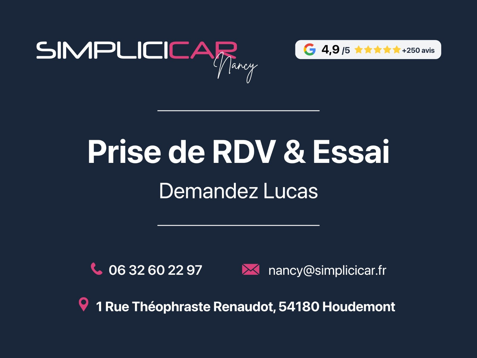 - SIMPLICICAR NANCY : 1, RUE THEOPHRASTE RENAUDOT 54180 HOUDEMONT / 06-32-60-22-97 / nancy@simplicicar.fr